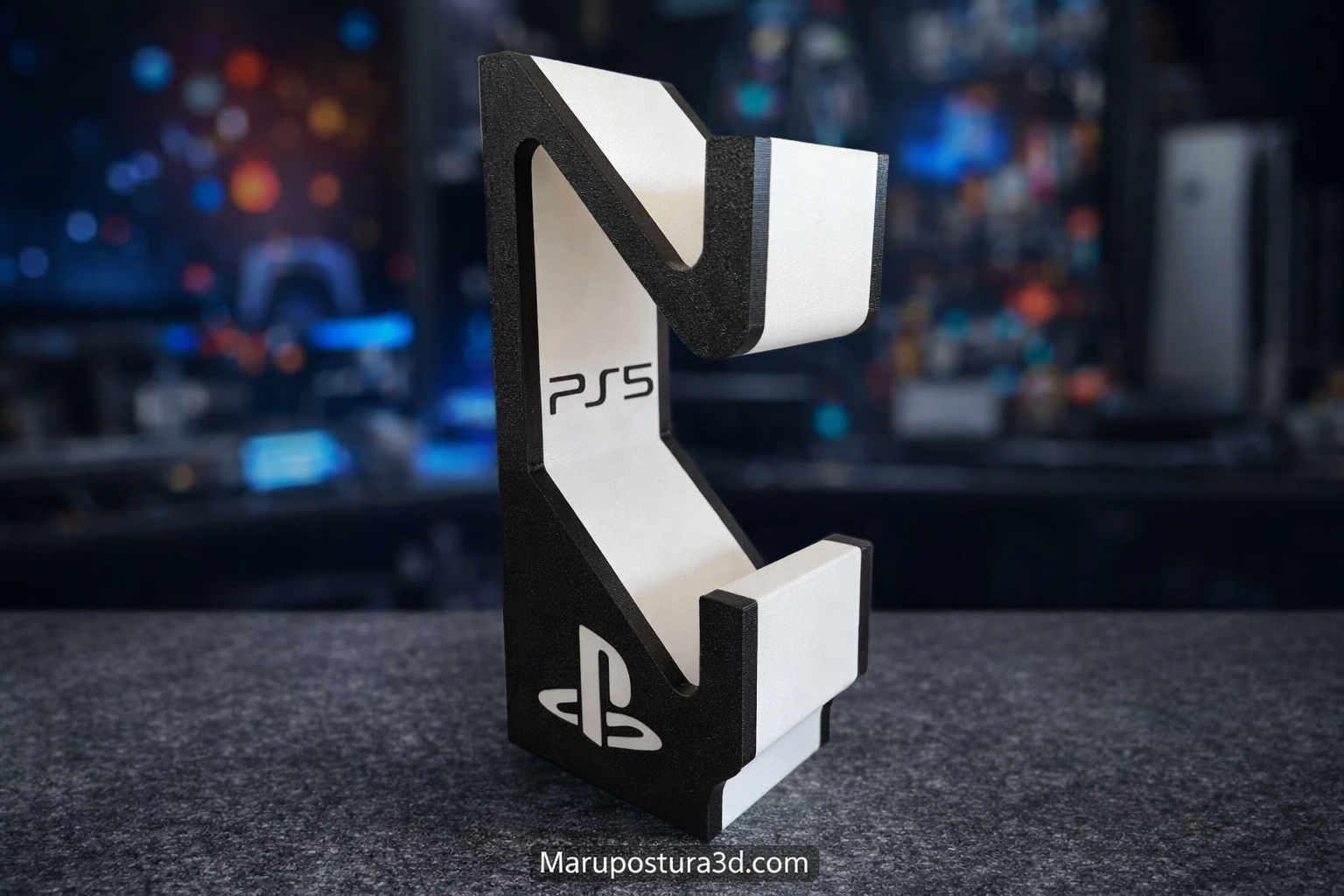 Un soporte minimal que deja tu mando PS5 firme y bonito. Se imprime en negro o blanco (sin mezclas), para que combine perfecto con tu setup.